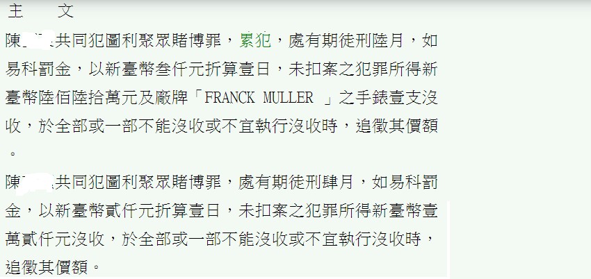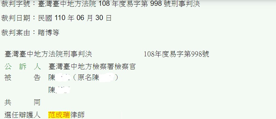 本案的委任人為兩位陳姓被告,被檢察官指稱以營利之方式提供賭博場所聚眾賭博,違反刑法第268條圖利聚眾賭博罪,另基於其他犯意對他人有恐嚇危害安全行為而成立刑法第305條之恐嚇罪,經由本人到庭為其辯護,其恐嚇部分法院為無罪判決,圖利聚眾賭博部分法院分別判處兩人6月及4個月有期徒刑,經本人為被告利益爭取下,法院給予二位被告易科罰金之機會。