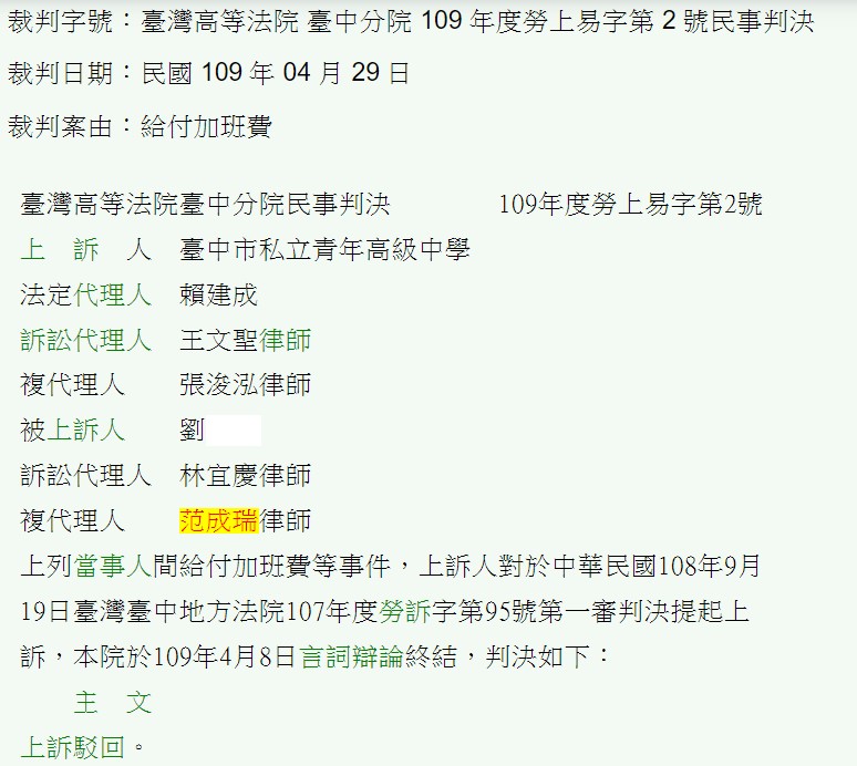 本案的委任人為劉姓原告,擔任被告高中學生宿舍之舍監,被告並未依勞基法給付加班費且未依法按月為被上訴人提繳退休金,致被上訴人受有退休金6萬3,630元之損害,原告因而提起訴訟,本案的被告高中不服一審的判決結果而提起上訴,經由本人及林律師的合作為原告爭取權益,二審法院駁回被告知上訴理由,仍維持一審之判決結果。