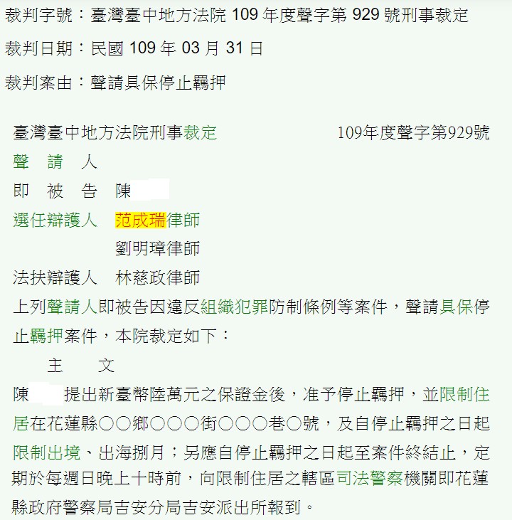 本案的委任人為陳姓被告,經本案受命法官訊問後,認為被告涉犯組織犯罪防制條例第3 條第1 項後段之參與犯罪組織、刑法第339 條之4等罪,法院認為其犯罪嫌疑重大,又有事實足認被告有反覆實施同一犯罪而予以羈押,經過本人以被告均坦承犯行等事由聲請停止羈押,法院採納本人之建議,以被告繳納6萬元保證金及定期到指定派出所報到來代替羈押處分。