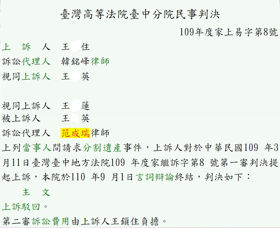 此案件本人為被上訴人之委任律師,本人於109年間替原告(即本案的被上訴人)提起分割共有物訴訟,請求法院就原告及被告所繼承之遺產來作分割,被告不服一審法院的分割方式而提上訴,二審中經有本人為原告爭取其權益,法院仍維持一審對原告有利之判決,駁回被告上訴。