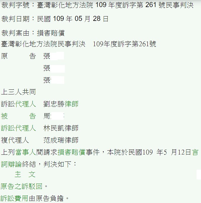 本案的委任人為周姓被告,於民國108 年1 月22日下午1 時30分許,駕駛普通重型機車與被害人發生碰撞,被害人因此死亡,被害人的子女依此向被告請求損害賠償新台幣60元。本案,由本人與另一訴訟代理人提出肇因是被害人逆向行駛且有闖紅燈行為所致,被告完全遵守且符合交通規則為被害人辯護,法院最後也採信此說詞,而駁回原告之請求,被告因此不須負損害賠償之責。