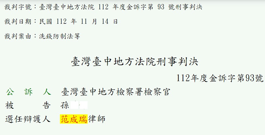 本案的委任人為孫姓被告,其與其他共犯涉嫌違反洗錢防制法第14條之一般洗錢罪,案件經檢察官起訴,在法院審理中被告委由本人為其辯護,經由本人爭取之下,法官採信本人之說詞,改認被告犯圖利聚眾賭博罪,雖處有期徒刑肆月,但給予緩刑參年而不需入監服刑。