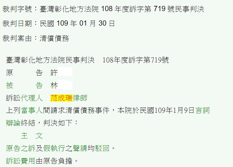 本人則以本件原告雖提出系爭支票乙紙,然系爭支票僅能證明惟原告所簽發及由被告兌領,然無法證明原告簽發系爭支票之原因如原告所述,係被告向原告借票周轉,等理由為被告辯護,而法院亦採信本人替被告在法院表達之說詞而判被告勝訴。