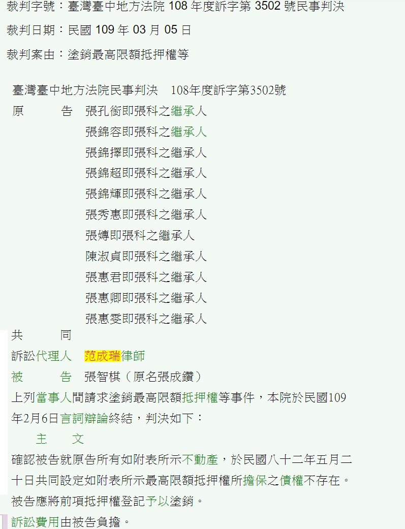 原告主張被告就原告所繼承之如附表所示地號土地,於民國82年5月20日共同設定登記如附表所示之本金最高限額新臺幣75萬元抵押權所擔保之債權不存在,為被告所否認,原告遂委任本人提起民事訴訟。本人主張被告與繼承人間並無系爭債權即消費借貸關係存在,縱使存在亦已罹於時效,而經過5 年後,該債權已非系爭抵押債權所擔保範圍,法院採信本人之主張,於是判決原告勝訴,被告應將抵押權登記予以塗銷,訴訟費用由被告負擔。