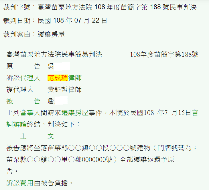本案的委任人為吳姓原告,原告主張本案所爭執的房屋原為詹姓被告所有,原告於107年6月21日因拍賣取得所有權,惟房屋迄今仍為詹見忠之子即被告占有使用,顯已侵害原告對系爭房屋之所有權利。本人遂以民法第767條規定,為原告請求法院將係爭房屋轉讓與原告,法院採納本人之主張,認為被告屬無權占有系爭房屋,應將該房屋遷讓返還與原告。