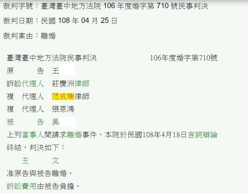 本案的委任人為吳姓原告,原告為中華民國國民,被告為越南國人,兩造於民國105年6月17日在越南芹苴市結婚,雙方並約定被告婚後來臺生活,以原告之住所為共同住所。被告於婚後來臺與原告同居於臺中市。詎料,被告於106年5月24日返回越南後即拒絕回臺,原告遂提起離婚訴訟,本人及莊律師主張告無正當理由,即拒絕返臺與原告同居,其情節合於民法第1052條第1項第5款之離婚事由。法院亦認同本人之主張准予原告與被告離婚。