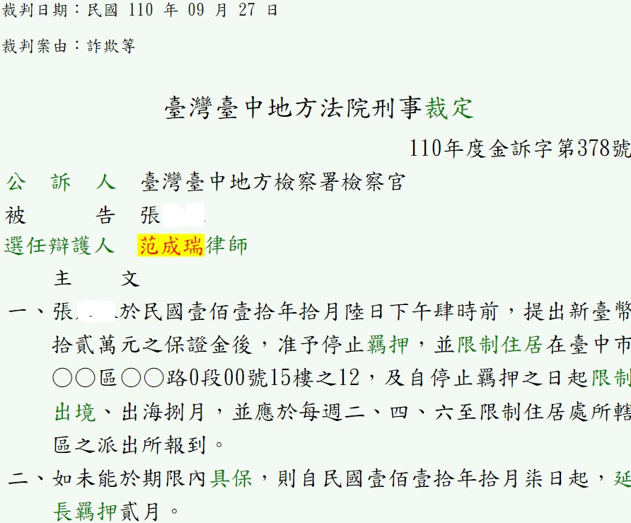 本案的張姓被告涉嫌違反刑法第339條之詐欺罪,且涉及3人以上對他人施用詐術而構成第339條之4遭檢察官起訴,由於法院擔心其有串證或逃亡的可能,所以給予被告羈押之不利處分,而後經由本人等律師努力爭取,法院同意被告得以具保及限制住居代替羈押處分,被告在接受審判期間不需在看守所度過。
