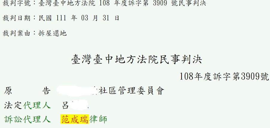 被告違法增建而佔用了社區共有部分之土地(公共設施),被佔有的土地屬於無權占有,經由原被告雙方協調未果,原告(某社區管理委員會)遂委託本人提起民事訴訟,經由本人爭取,法院判原告勝訴,被告須將佔有共有土地上之增建物拆除,返還全體共有人,而本案的訴訟費用亦由被告負擔。